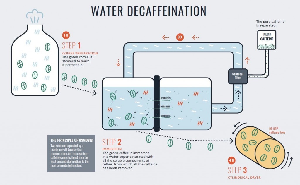 En este caso, los granos verdes se sumergen en agua caliente, lo que permite disolver tanto la cafeína como otros compuestos solubles. Posteriormente, esta agua pasa a través de filtros de carbón activo que retienen específicamente la cafeína, conservando el resto de sustancias responsables del aroma y el sabor. Este proceso se repite de forma controlada hasta eliminar prácticamente toda la cafeína, sin necesidad de utilizar disolventes químicos.